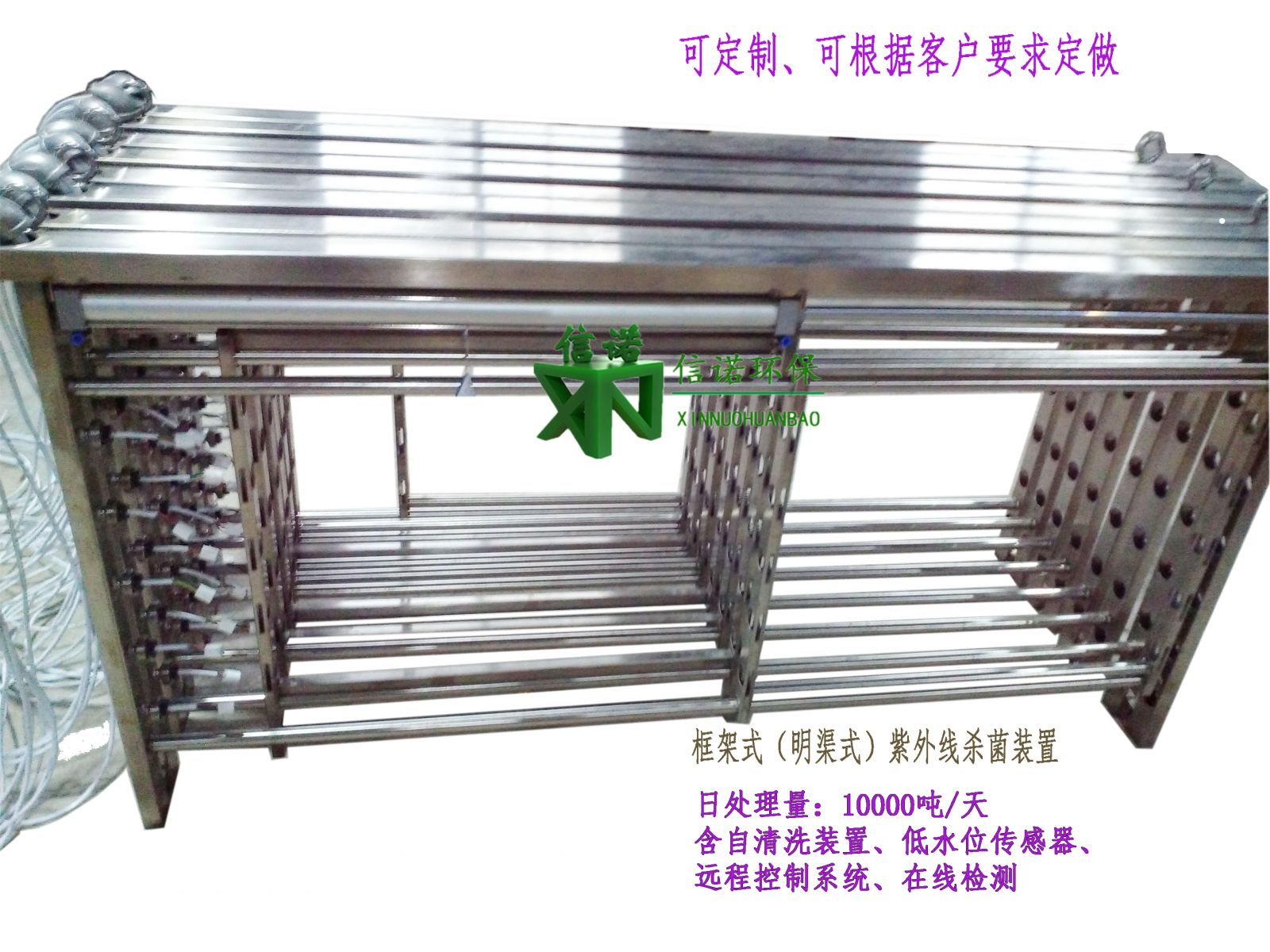 3、本產(chǎn)品可用于替代常規(guī)的加氯消毒工藝設(shè)備。紫外線消毒模塊:放置于水渠內(nèi),將燈管全部沒于水下作業(yè)。